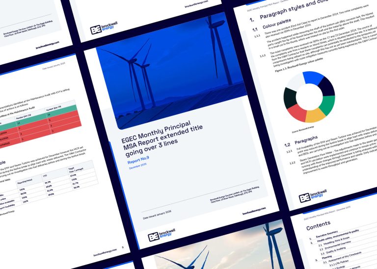 We subtly reinforced Brockwell Energy’s brand by introducing key visual elements to the front cover which feature consistently throughout the document pages. By designing an adaptable front cover, users can easily choose from up to three different cover styles: graphical, photographic and photographic with a blue overlay. Referring to the existing brand fonts as a foundation, we developed a well-balanced hierarchy for typography which was set as easily applied type styles. Furthermore, table styles and colour palette were built into the template to offer users an easy and consistent way of applying information.