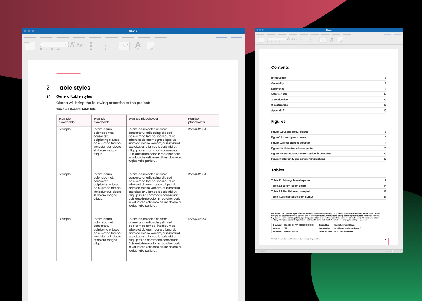 Okana commissioned Firefly to create a suite of Microsoft Word templates. This included bespoke templates for a standard report, short-form report and a simple agenda document. Each of these were to be designed in line with their existing brand whilst ensuring the templates are clean and functional.
